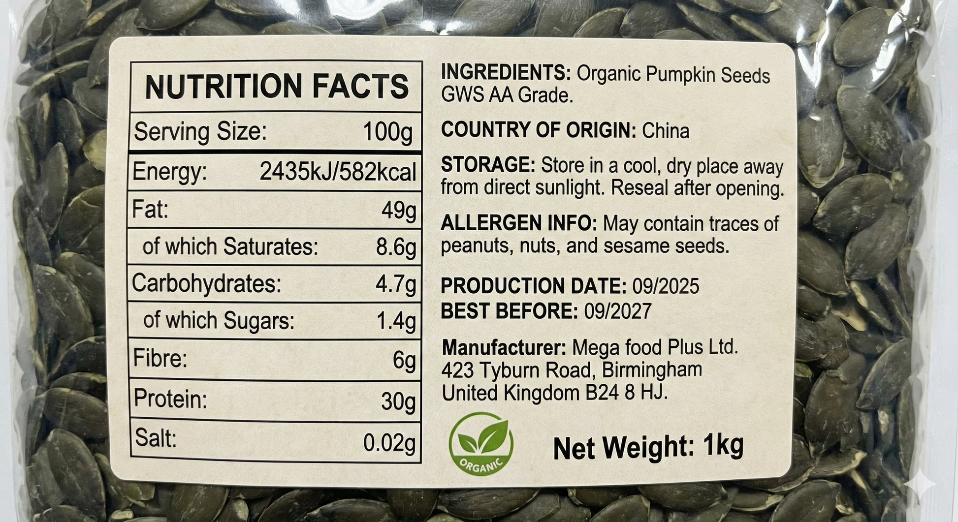 Ingredients: 100% Pumpkin Seeds (GWS Variety).